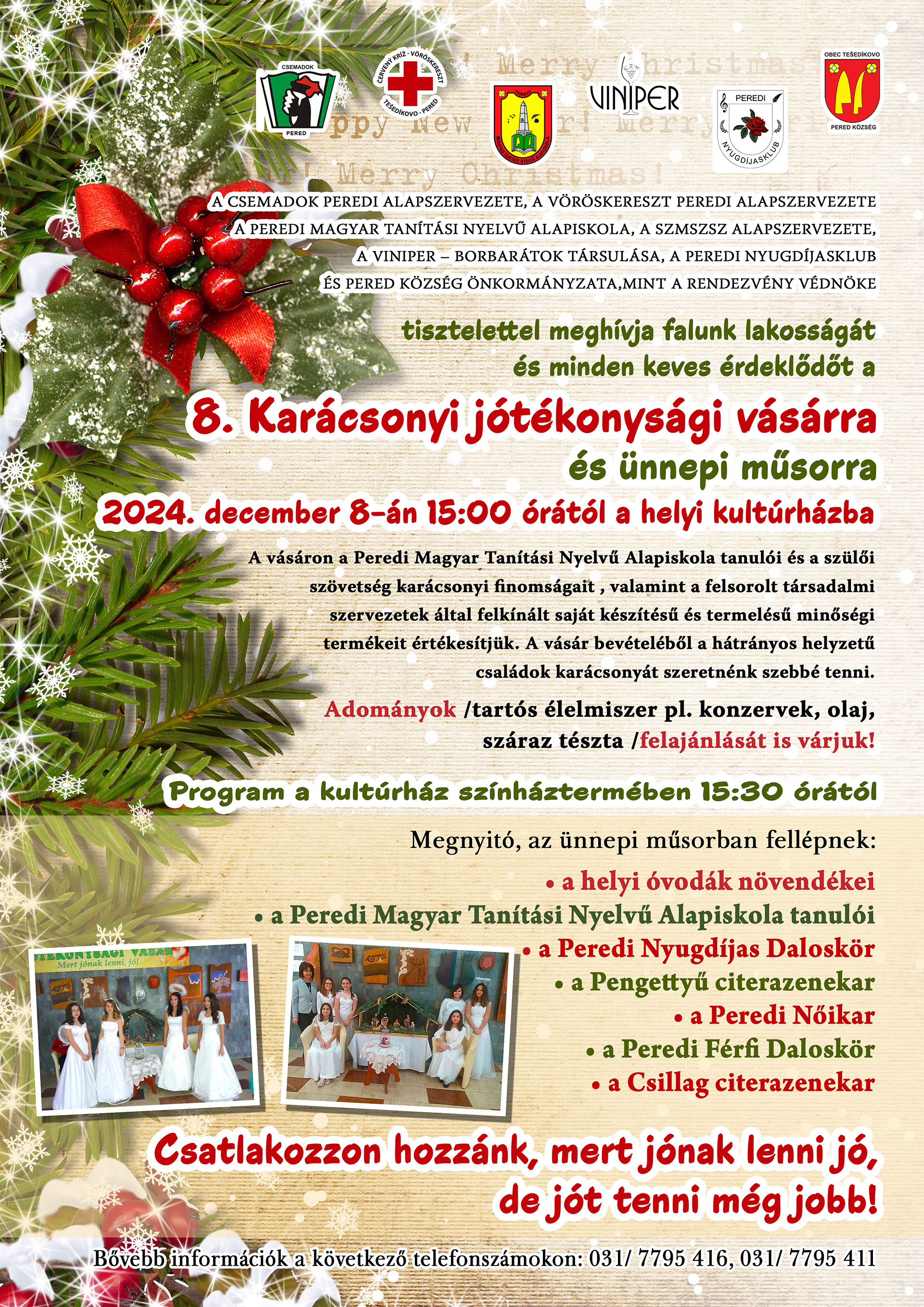 A Csemadok és a Vöröskereszt helyi alapszervezete, a Peredi Magyar Tanítási Nyelvű Alapiskola, a Viniper – borbarátok társulása, a Peredi nyugdíjasklub és Pered község önkormányzata tisztelettel meghívja falunk lakosságát és minden kedves érdeklődőt a 8. Karácsonyi jótékonysági vásárra és ünnepi műsorra december 8-án vasárnap 15 órától a helyi kultúrházba. 15 órától jótékonysági vásár és 15:30 órától fellépnek a helyi óvodák növendékei, a magyar alapiskola tanulói, a Peredi nyugdíjas daloskör, a Pengettyű és a Csillag citerazenekar, és a Peredi Férfi Daloskör.
