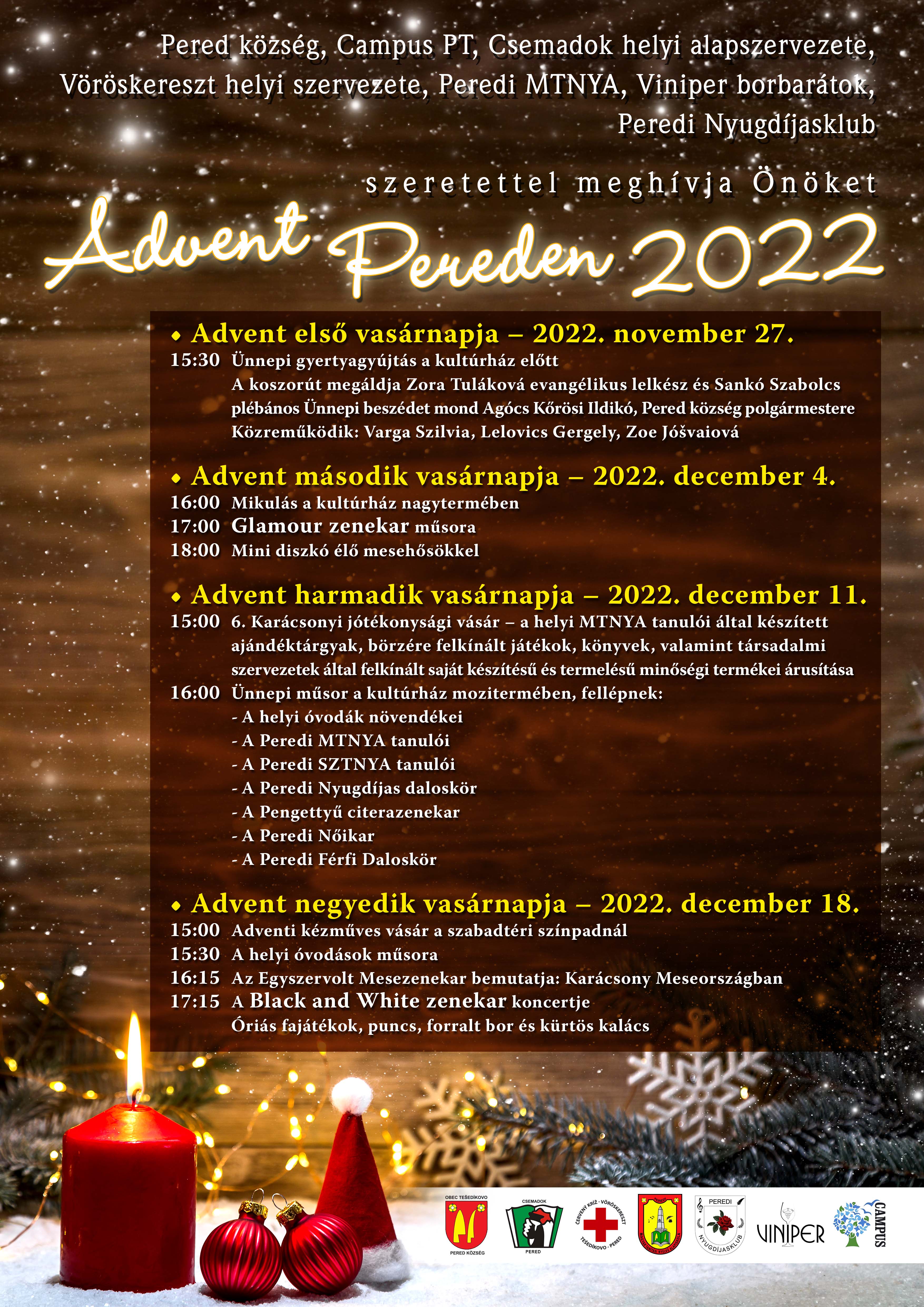 15:00 6. Karácsonyi jótékonysági vásár – a helyi MTNYA tanulói által készített ajándéktárgyak, börzére felkínált játékok, könyvek, valamint társadalmi szervezetek által felkínált saját készítésű és termelésű minőségi termékei árusítása
