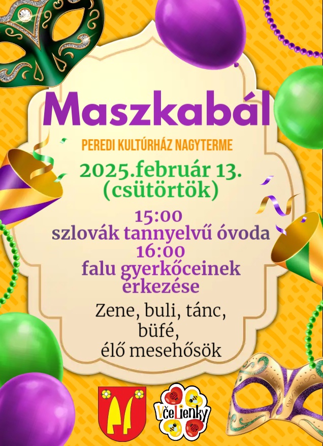 Pered község és a Szlovák Tannyelvű Óvoda Szülői Szövetsége szeretettel meghívja a kedves gyerkőcöket a Maszkabálra, amelyre 2025. február 13-án (csütörtökön) kerül sor a peredi kultúrház nagytermében. A zenéről és jó hangulatról DJ Csongi gondoskodik.