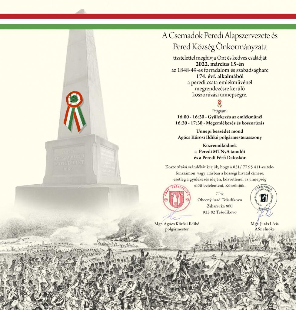 A Csemadok Peredi Alapszervezete és Pered község Önkormányzata tisztelettel meghívja Önt és kedves családját 2022. március 15-én az 1848/49-es forradalom és szabadságharc 174. évf. alkalmából a peredi csata emlékművénél megrendezésre kerülő koszorúzási ünnepségre.