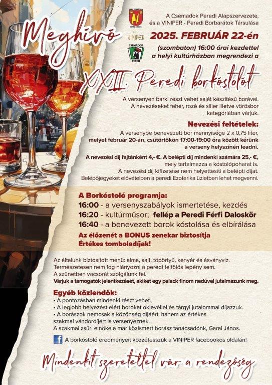 A Csemadok Peredi Alapszervezete és a Viniper Peredi Borbarátok Társulása 2025. február 22-én 16.00 órai kezdettel a peredi kultúrházban megrendezi a XXII. Peredi Borkóstolót. A belépő ára 25 Eur, mely tartalmazza a kóstolópoharat és vacsorát is. Belépőjegyeket elővételben az Ezoterika üzletben lehet megvásárolni. Az élőzenét a Bonus zenekar biztosítja, fellép a Peredi Férfi Daloskör. Mindenkit szeretettel vár a rendezőség!