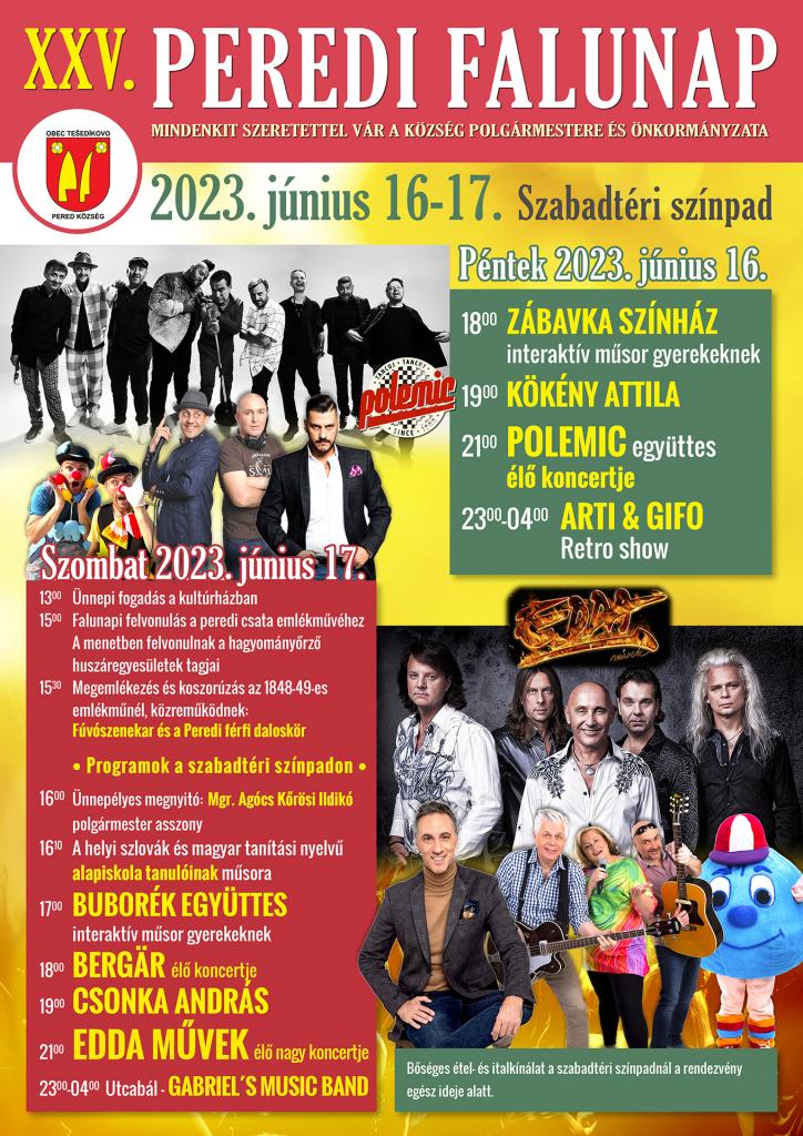 Pered község polgármestere és Önkormányzata szeretettel vár mindenkit a XXV. Peredi Falunapra, amely 2023. június 16-án és június 17-én kerül megrendezésre a szabadtéri színpadon.
