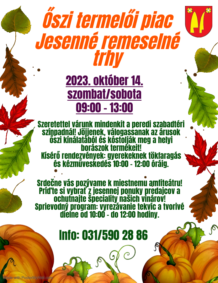 Pered község szeretettel meghív minden kedves érdeklődőt az Őszi termelői piacra, amely 2023. október 14-én kerül megrendezésre a helyi szabadtéri színpadnál.