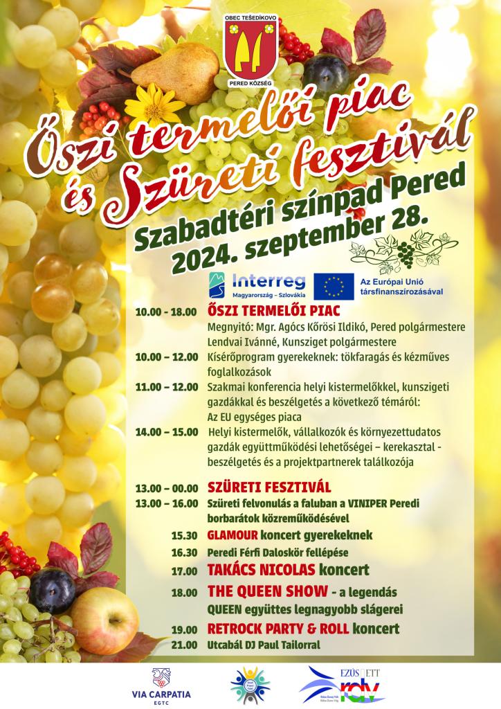 Pered község Kunsziget községgel együttműködve szeretettel meghívja az Őszi termelői piacra és Szüreti fesztiválra, amelyre szeptember 28-án kerül sor a helyi szabadtéri színpadon. 10 órától kezdődik a termelői piac, ahol árusok kínálják finomságaikat és kézműves termékeiket. Délelőtt folyamán már hagyományosan a gyermekeket tökfaragás és kézműveskedés várja. 13 órától Szüreti felvonulás a faluban a VINIPER Peredi borbarátok közreműködésével. 15:30kor a Glamour zenekar gyerek koncertje nyitja meg a programot a szabadtéri színpadon. Utánuk a Peredi Férfi Daloskört hallhatják, 17 órától pedig Takács Nicolas énekel majd. 18 órától a Queen legnagyobb slágerei csendülnek fel a The Queen Show előadásában. Utánuk a Retrock Party and Roll szórakoztatja a közönséget. 21 órától a jó hangulatról DJ Paul Tailor gondoskodik.