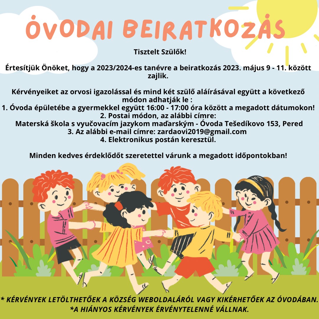 2. Postai módon az alábbi címre: Materská škola s vyučovacím jazykom maďarským - Óvoda, Tešedíkovo 153, 925 82 Tešedíkovo