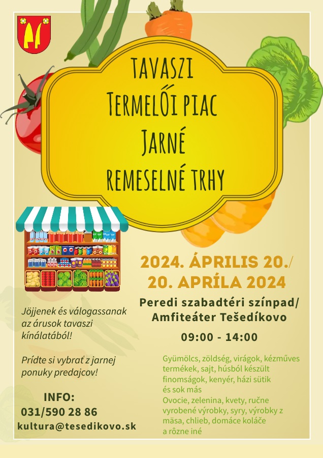 Pered község 2024. április 20-án Tavaszi termelői piacot szervez a helyi szabadtéri színpadnál 9 órától 14 óráig. Jöjjenek és válogassanak az árusok tavaszi kínálatából (gyümölcs, zöldség, virágok, kézműves termékek, sajt, húsból készült finomságok, kenyér, házi sütik és sok más) és kóstlják meg a helyi borászok termékeit!