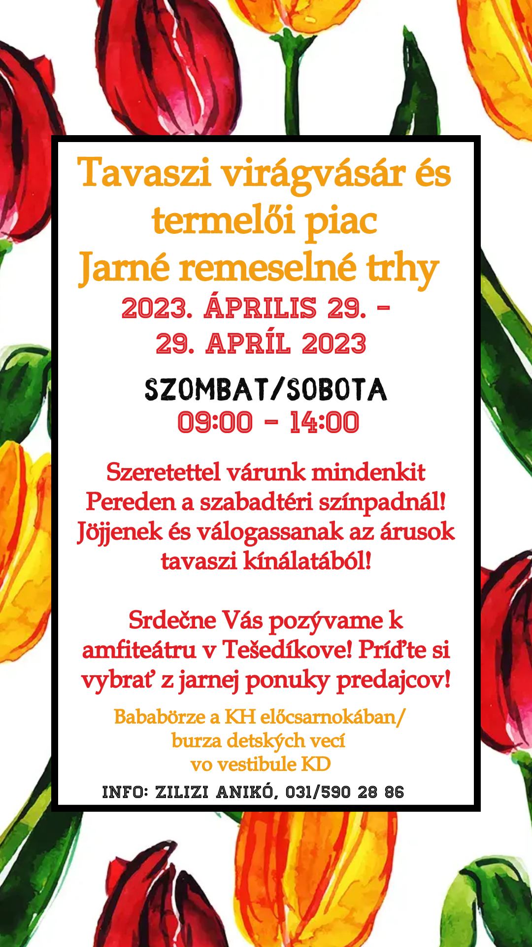 Szeretettel várunk mindenkit a peredi szabadtéri színpadnál a Tavaszi virágvásárra és termelői piacra, 2023. április 29-én. Jöjjenek és válogassanak az árusok tavaszi kínalatából, és kóstolják meg a finomabbnál finomabb termékeket. Az árusok a 031/590 28 86as telefon számon jelentkezhetnek.