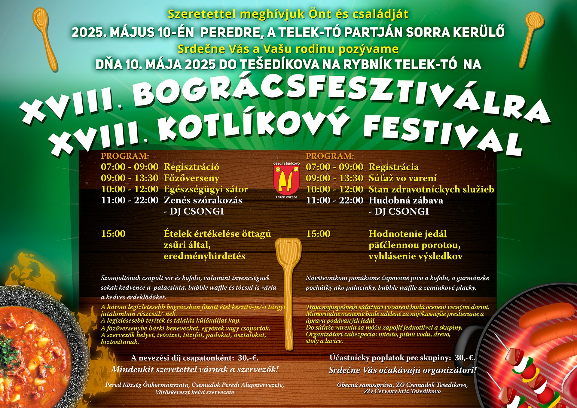 Pered község önkormányzata, a Csemadok peredi alapszervezete és a Vöröskereszt helyi szervezete mindenkit szeretettel vár a 18. bográcsfesztiválra, amelyre május 10-én kerül sor a Telektó partján. A főzőversenybe bárki benevezhet, egyének és csoportok is. A főzőversenybe bekapcsolódók regisztrációja 7órától 9óráig lesz, utána kezdetét veszi a főzőverseny. A fesztiválon 11 órától DJ Csongi szórakoztatja az embereket. Mindenkit szeretettel várnak a szervezők!
