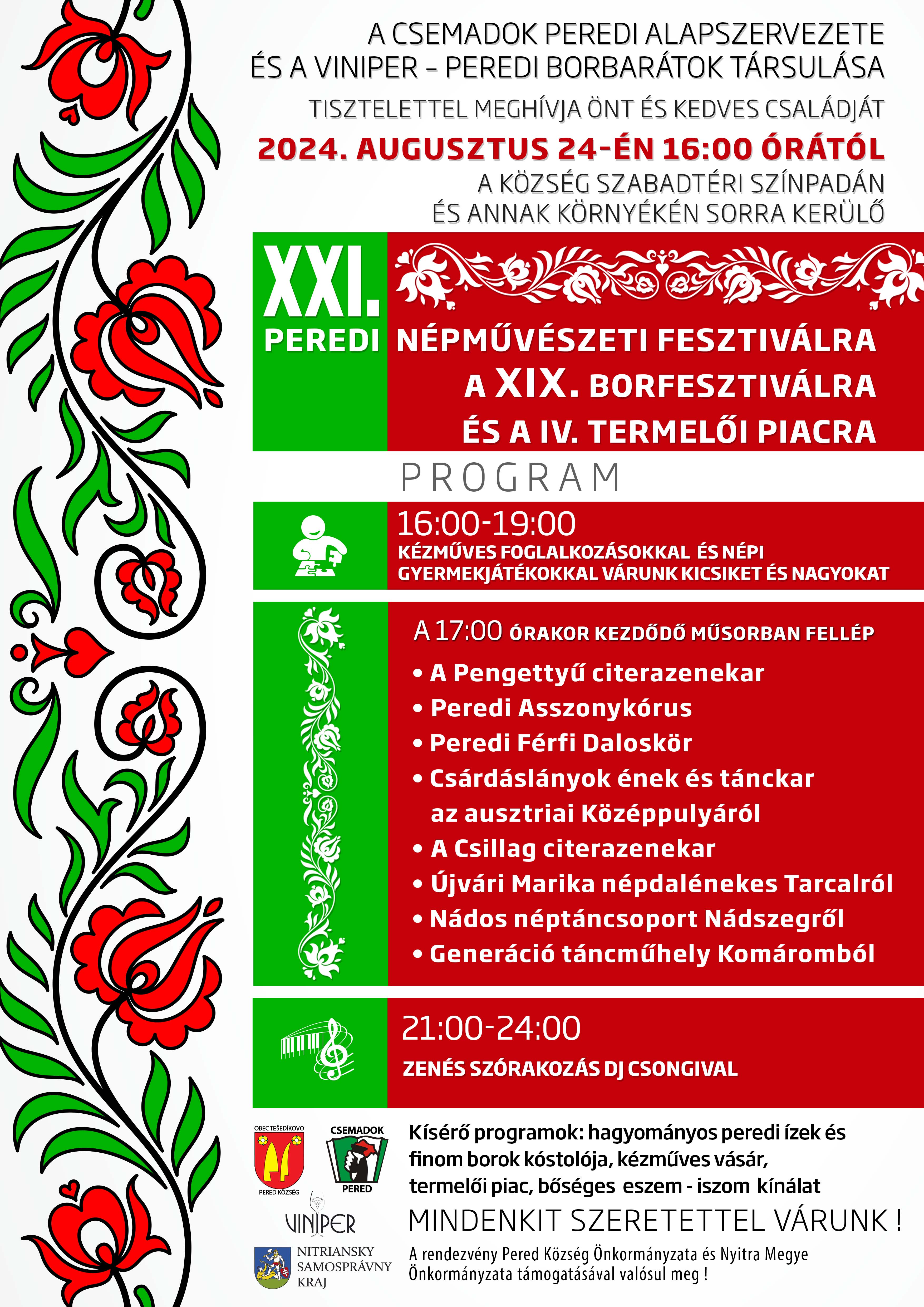 Pered község önkormányzata, a Csemadok helyi alapszervezete és a Viniper peredi borbarátok társulása szeretettel meghívja augusztus 24én 17 órától a község szabadtéri színpadán sorra kerülő XXI. Peredi népművészeti fesztiválra és XIX. Borfesztiválra. A program 17 órától kezdődik. Fellépnek a helyi csoportok, a Pengettyű citerazenekar, a Csillag citerazenekar, a Peredi Asszonykórus, a Peredi Férfi Daloskör, továbbá Csárdáslányok ének és tánckar az ausztriai Középpulyáról, a Újvári Marika népdalénekes Tarcalról, Nádos néptánccsoport Nádszegről és Generáció táncműhely Komáromból. Utánuk 21.00 órától zenés szórakozás DJ Csongival. Kísérő programok a következők: kézműves vásár, hagyományos peredi ízek és finom borok kóstolója, büfé, fábór készült játszópark kicsiknek és nagyoknak egyaránt, kézműves foglalkozások. Mindenkit szeretettel várnak.