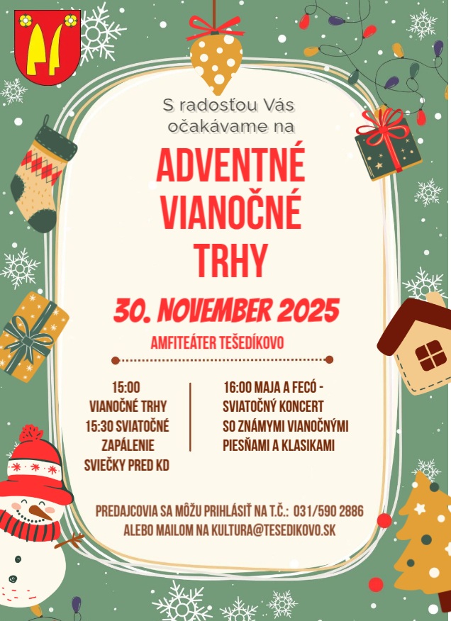 Srdečne vás očakávame na Adventné Vianočné trhy, ktoré sa uskutočnia 30. novembra 2025 (v nedeľu) na miestnom amfiteátri. Program je nasledovný: