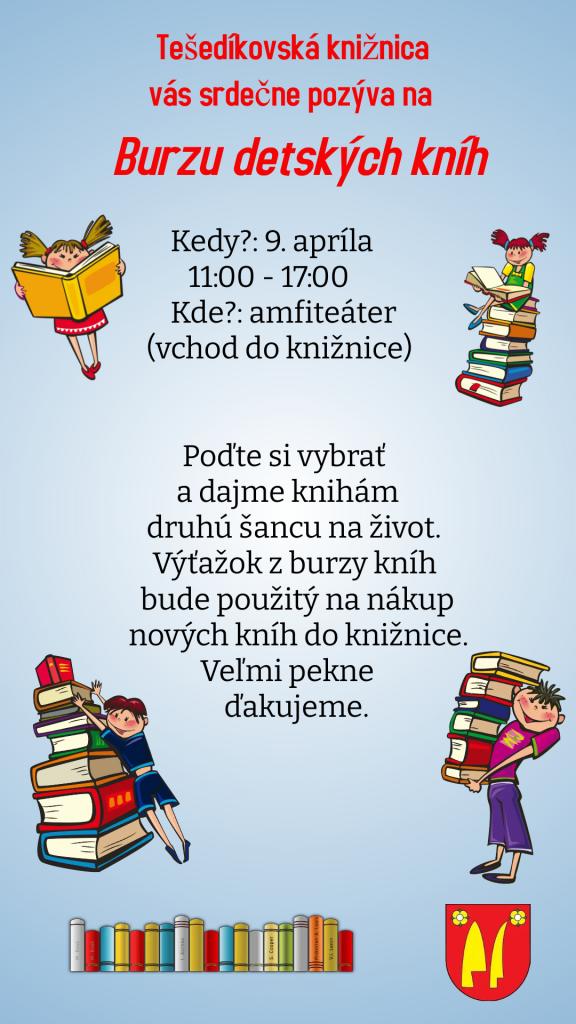 Sprievodným programom Veľkonočného rodinného dňa je burza kníh, kde si určite vyberú malí aj veľkí. Ak máte v skrini alebo na polici detskú knižku, mládežnícku beletriu, ktorú ste už prečítali, radi takýmto knihám dáme druhú šancu, tým, že sa dostane k niekomu inému. Knihy, ktoré na burzu darujete, môžete priniesť do knižnice počas otváracích hodín, v stredu a piatok od 15ej hodiny do 18ej hodiny. Výťažok z burzy kníh bude použitý na nákup nových kníh do knižnice. Veľmi pekne ďakujeme.