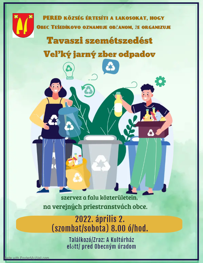 Obec Tešedíkovo oznamuje občanom, že 23. apríla 2022 v sobotu opäť zorganizuje tradičnú jarnú brigádu- zber odpadov na území obce.